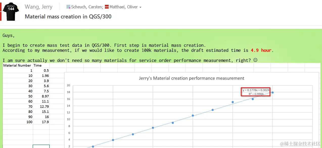 Excel里做一个line regression analysis, 得出R2 = 0.9984 > 0.99, 得出时间和material数量在这有限的10组测试数据表现为线性相关,