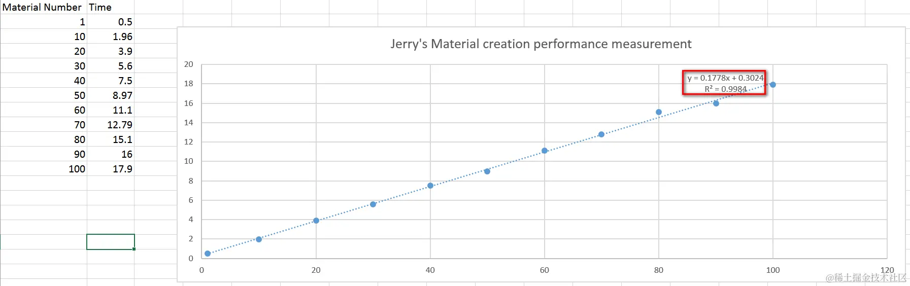 我的做法就是把创建1个,10个,20个,。。。100个material的时间分别测出来: