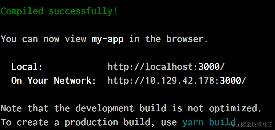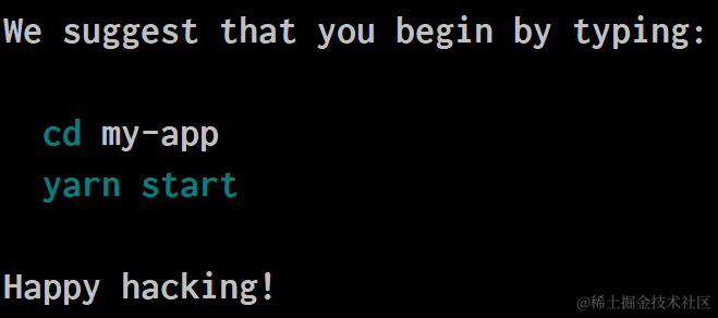成功执行后,会看到Success! Created my-app at XXXX的提示信息: