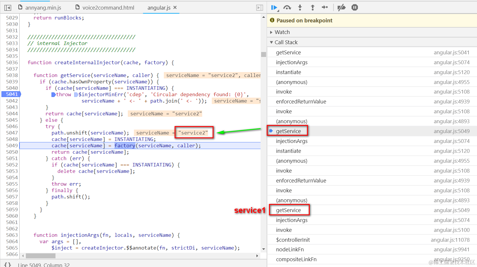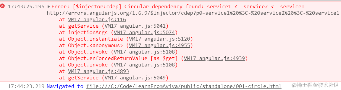 而service2又依赖于service1,此时Angular在cache里检测到service1还处于正在实例化的阶段,为了避免这种循环依赖,Angular框架直接报exception.