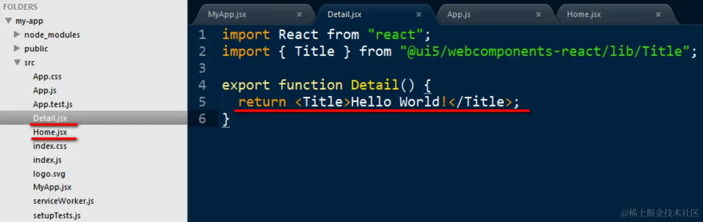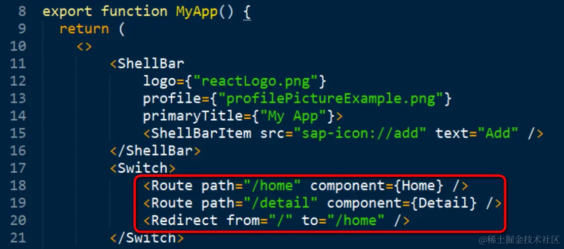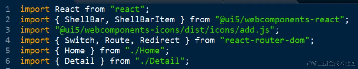 SAP UI5 Web Component不同React页面的跳转实现 已注销 2021-04-25 135 阅读1分钟 (1) 从react-router-dom里导入Switch,Route和Redirect组件: (2) 路径/home指定成加载Home Component ,/detail则加载Detail Component. 文件Home.jsx和Detail.jsx分别实现Component: (3) 测试:url后加上/home,则加载home Component: /detail组件的加载: 要获取更多Jerry的原创文章,请关注公众号"汪子熙":