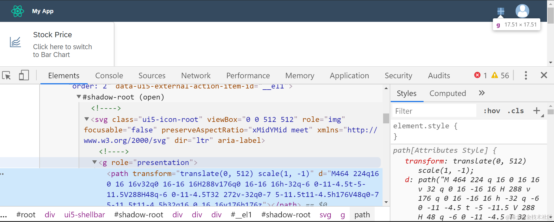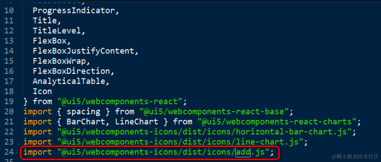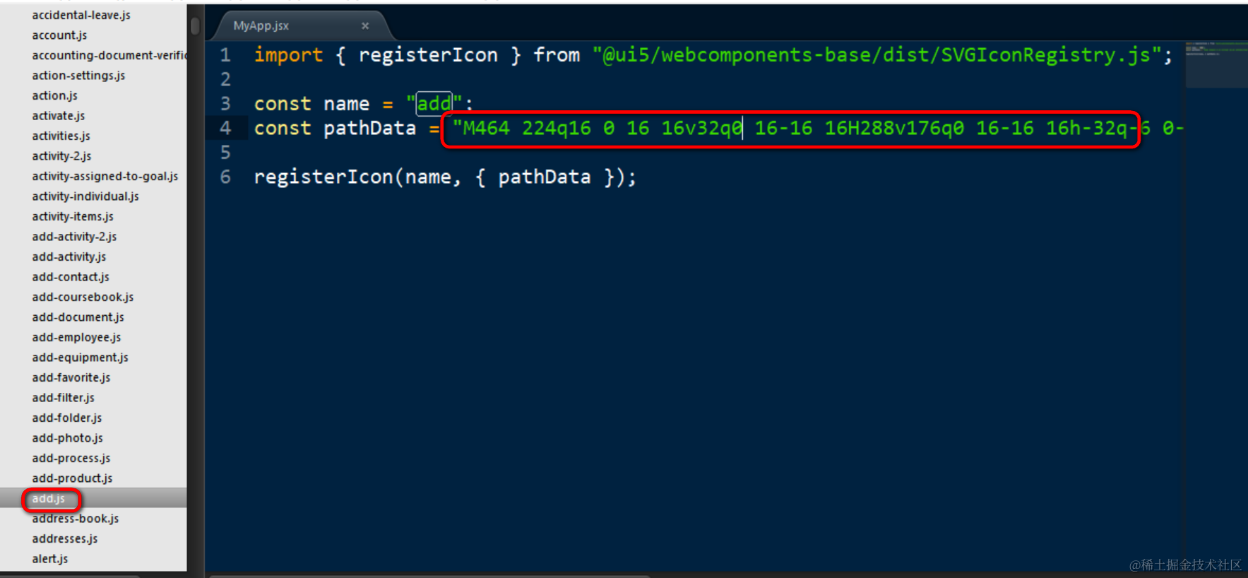 SAP UI5 Web Component的图标实现 已注销 2021-04-25 85 阅读1分钟 例子:我的SAP UI5 Web Component开发而成的React应用上,显示了这个加号图标: 在React Component里引入加号图标: 在此处给ShellBarItem的icon属性赋以add按钮: 运行时效果如下: 我们再回过头看看在代码里导入的add.js的内容: pathData里包含的值,其实就是基于SVG绘制而成的加号图标在浏览器里对应的g标签的d属性,如下图所示: 要获取更多Jerry的原创文章,请关注公众号"汪子熙":