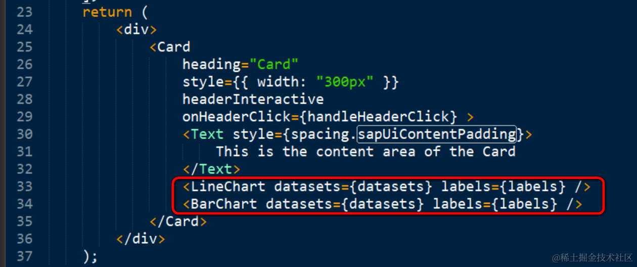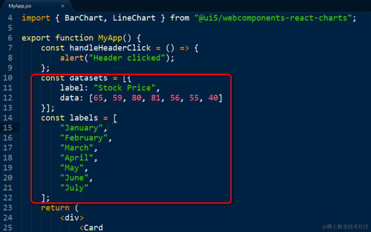 在自定义的React Component里,为图标创建数据集和数据标签对应的JavaScript数组: