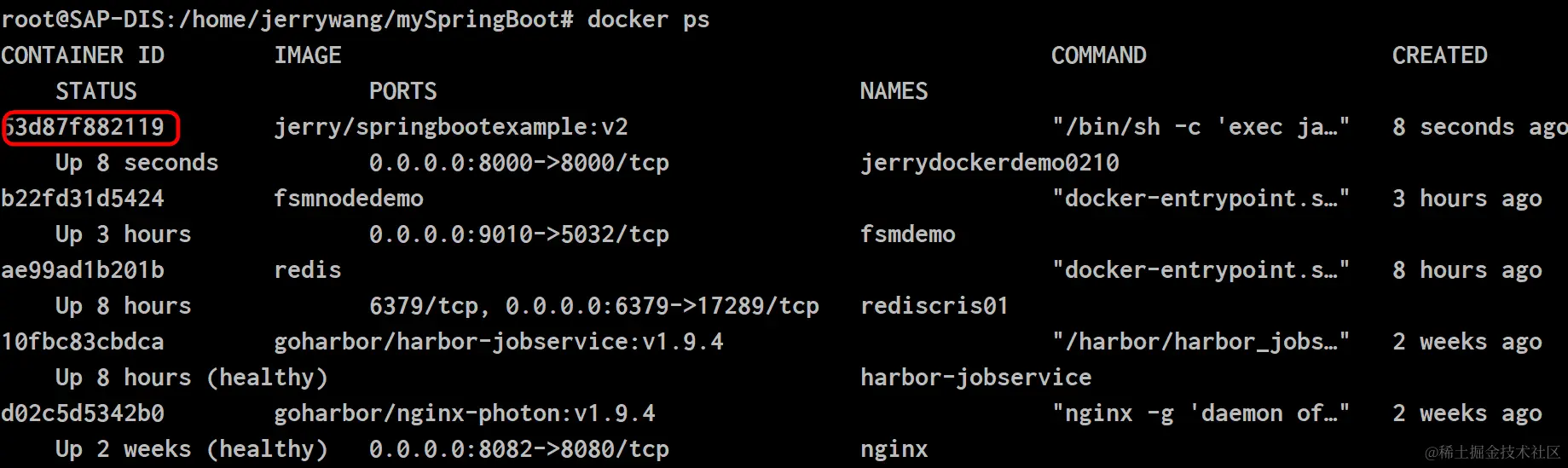 使用docker ps查看镜像id: