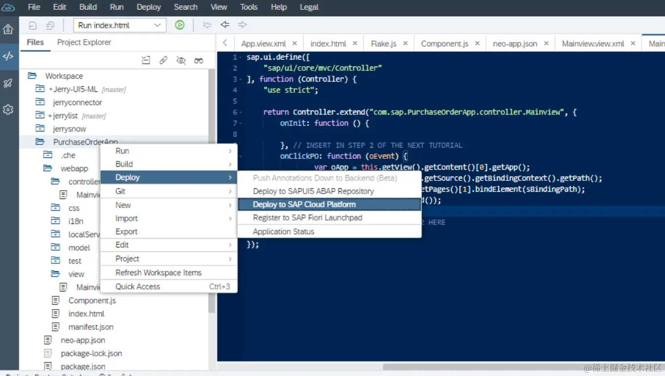最后通过右键菜单将这个应用从WebIDE部署到SAP云平台: