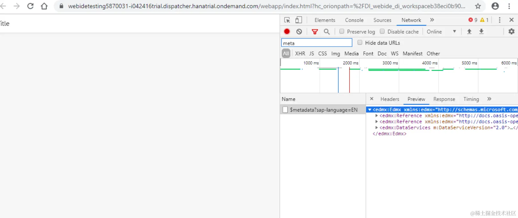 在Chrome开发者工具里看到OData服务的metadata已经可以成功取回了: