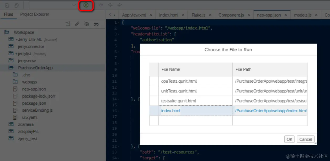 WebIDE会帮我们生成一个UI5应用的骨架,直接点run按钮试着运行: