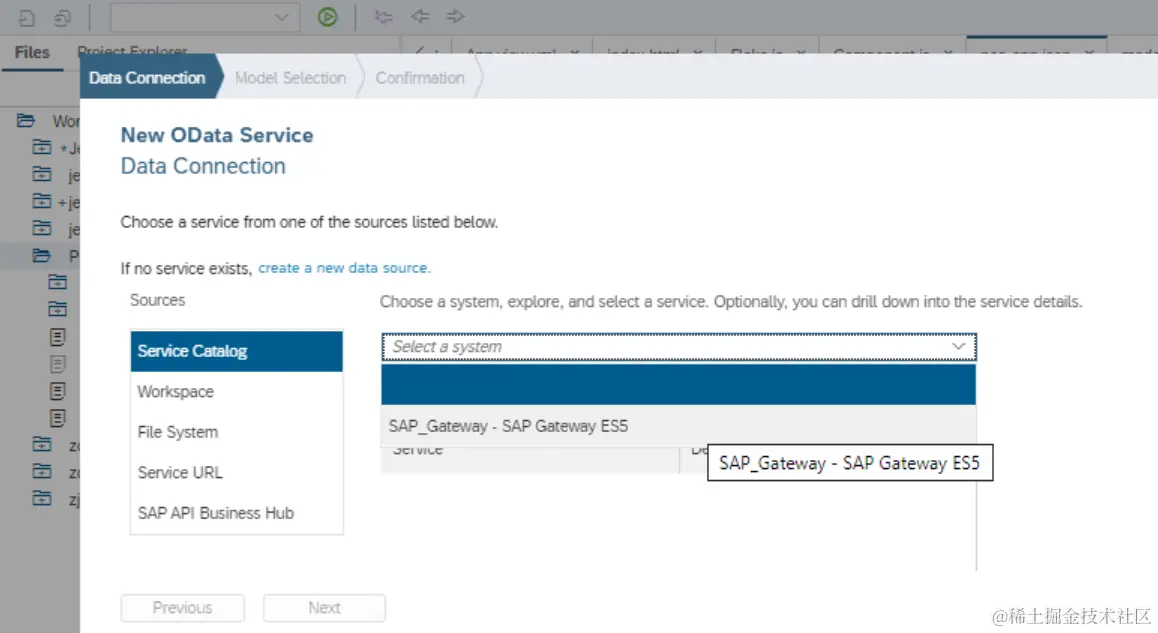从service catalog的下拉菜单里选择刚刚创建的Destination,能带出该Destination指向的ES5服务器上部署的所有OData服务:
