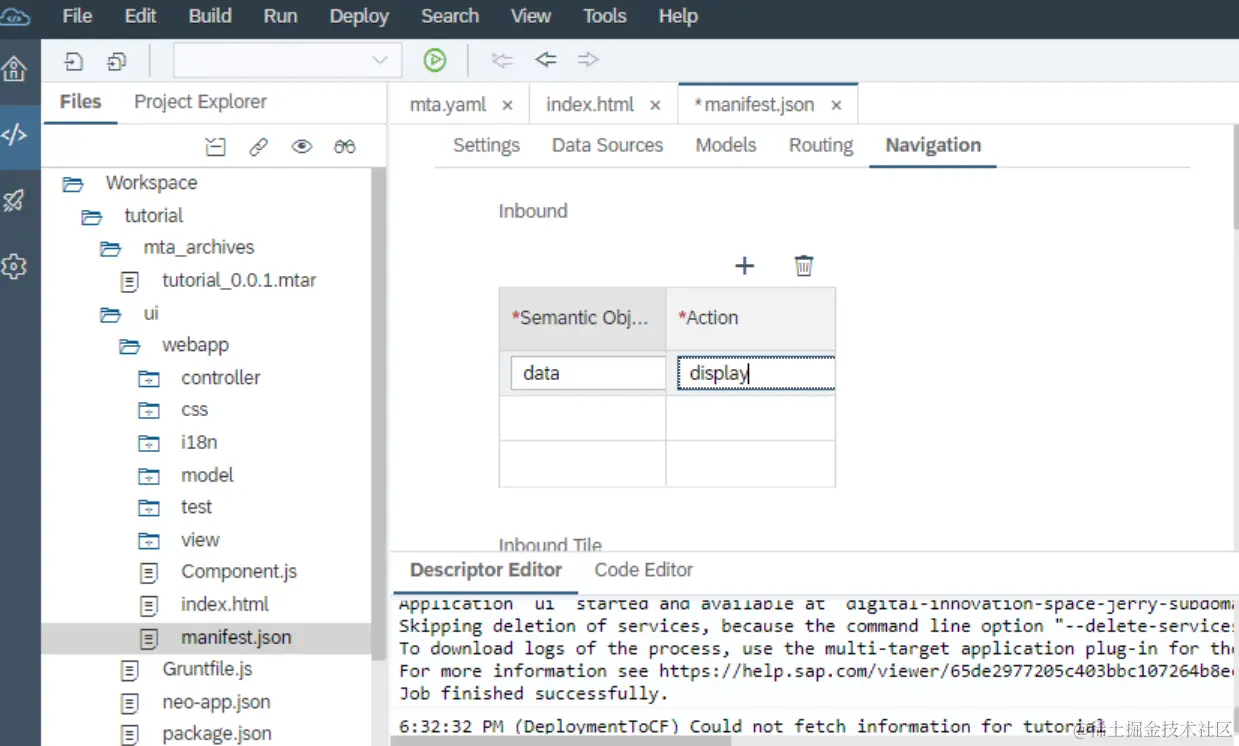在SAP云平台WebIDE里新建一个UI5应用并本地运行通过后,在webapp文件夹下打开manifest.json文件,进入navigation区域,semantic object维护成data,action维护成display: