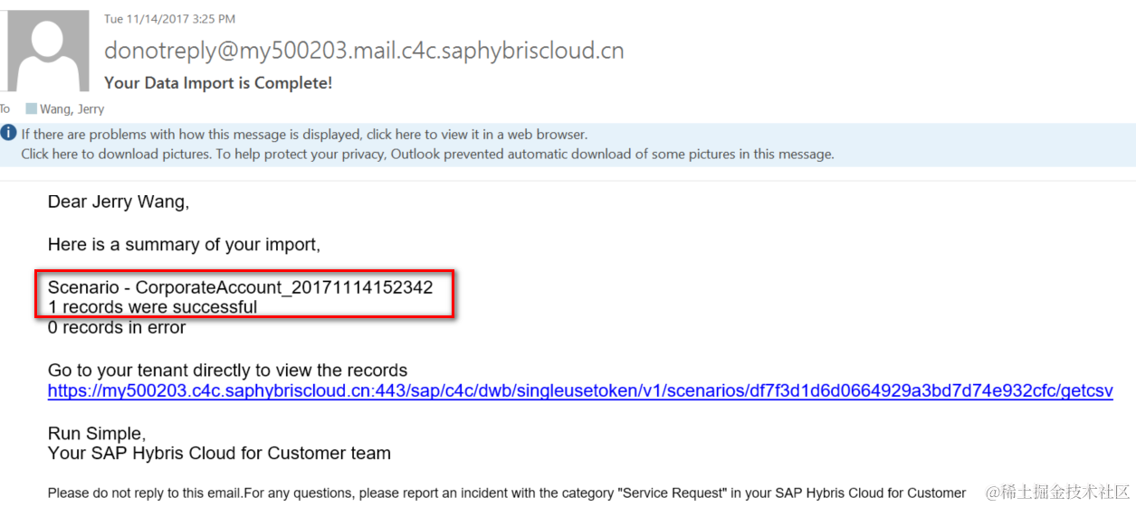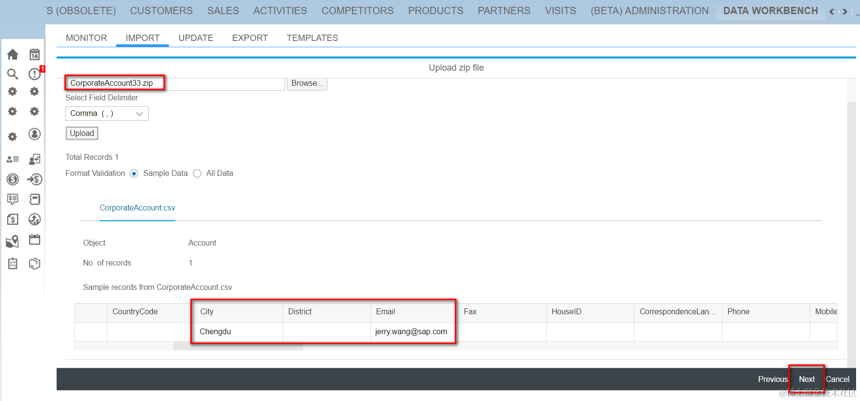 使用Excel导入数据到SAP Cloud for Customer系统 已注销 2021-04-25 140 阅读1分钟 假设要上传Account的数据到系统: 点download metadata: 自动download一个zip下来: 在folder Templates里维护要上传的Account data: 把维护好的excel重新打成zip, upload: 稍后在monitor里会观察到成功上传的task: 看到import成功的消息: UI上能搜索出这条今天(2017-11-14)创建的Account: 要获取更多Jerry的原创文章,请关注公众号"汪子熙":