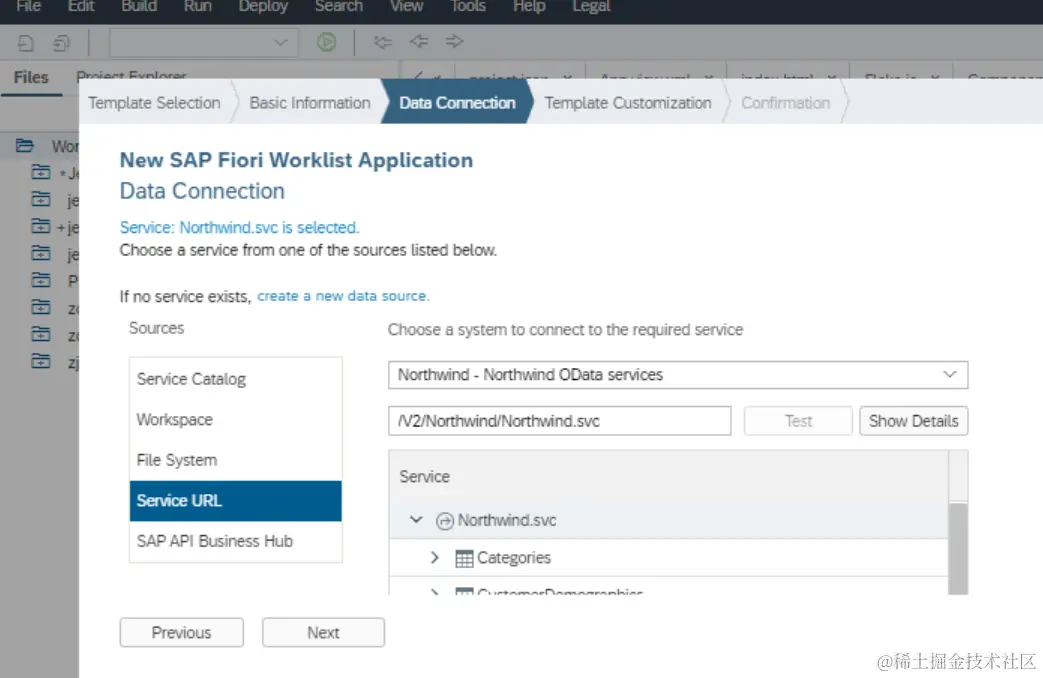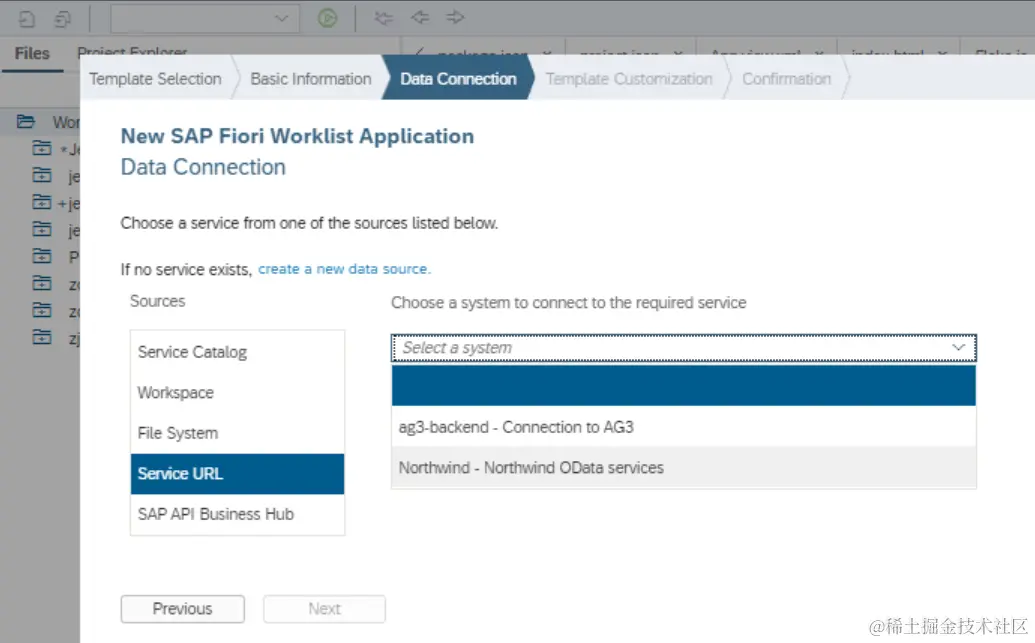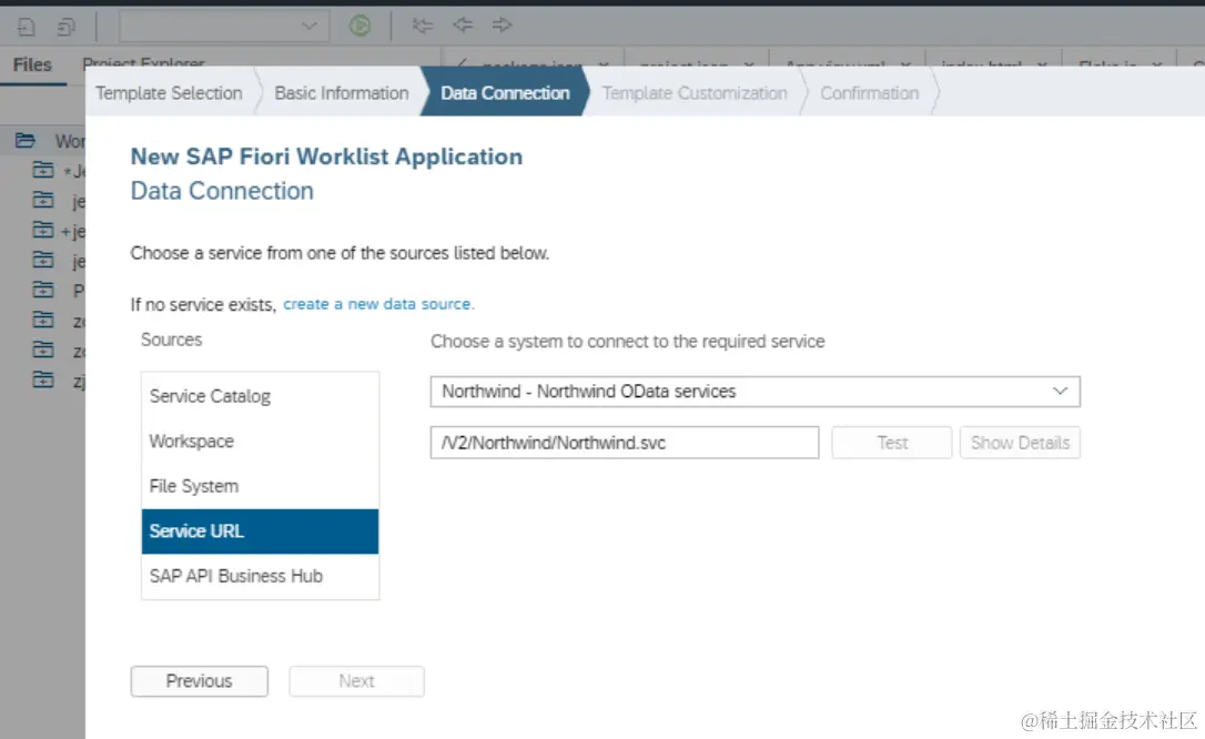 Values for the WebIDEUsage property determine how the SAP Web IDE interprets the destination definition & presents it to you for connection and consumption. The value odata_gen signifies that the destination represents generic OData services (as opposed to OData services that are hosted on an SAP Gateway system, for example) and that the full, specific OData service URL specification is to be provided in the SAP Web IDE New Project wizard, specifically via the Service URL data connection source, as shown in this example scenario:
