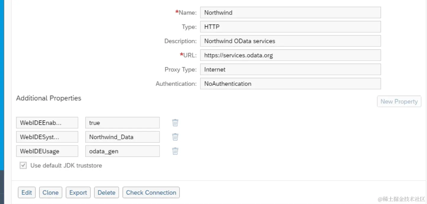新建一个Destination,类型为HTTP,再添加三个额外的Properties,其中WebIDEUsage设置为odata_gen: