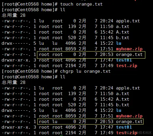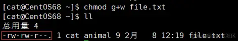 3、现在将该文件的写权限给 dog 。即:给同组用户赋予 w 权限。