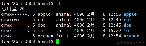- 但是现在dog是无法进入 /home/cat 目录的,我们看一下 /home/cat 目录的权限: