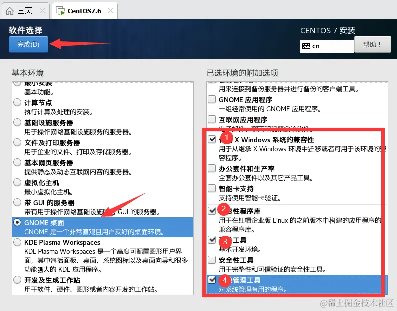 14、选择以下内容,点击完成,退出这个界面之后,系统会检查软件依赖关系,需要等一会。建议不要乱点,防止机器卡死。