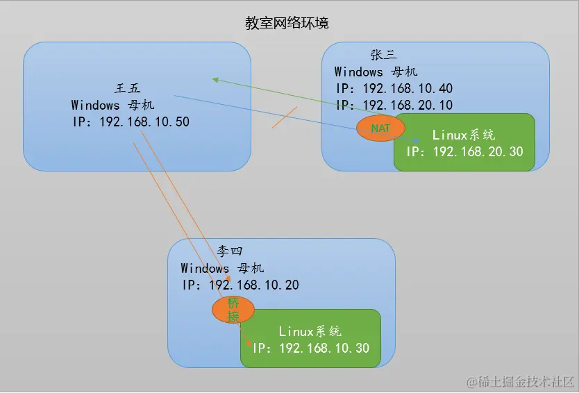 - 桥接:和母机在同一个网段下,可能会造成IP冲突。