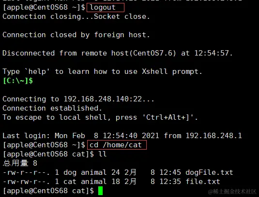 - apple用户重新登录,可以进入 /home/cat 目录。