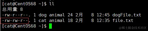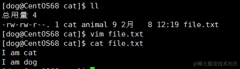 7、dog用户可以使用 ll 指令展示目录下的内容。并且可以修改 /home/cat 目录下的 file.txt 文件。