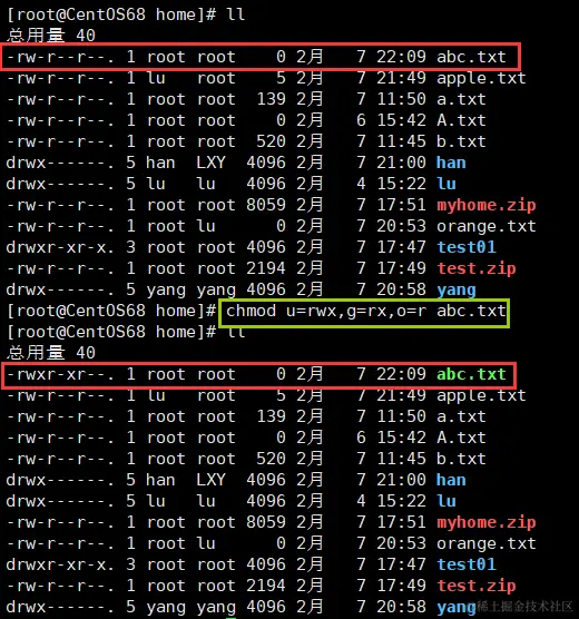 # 例:给 abc.txt 文件的所有者读写执行权限,给所在组读执行权限,给其他用户读权限。