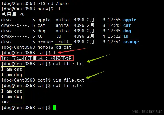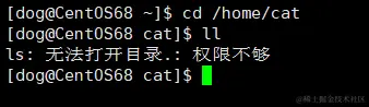 - 可以看到,这时 dog 可以进入 /home/cat 目录,但是无法使用