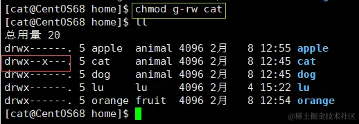 - 我们将 /home/cat 目录的 x 权限赋予同组用户。