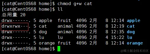 发现修改用户组之后, apple还是无法进入 /home/cat 目录。