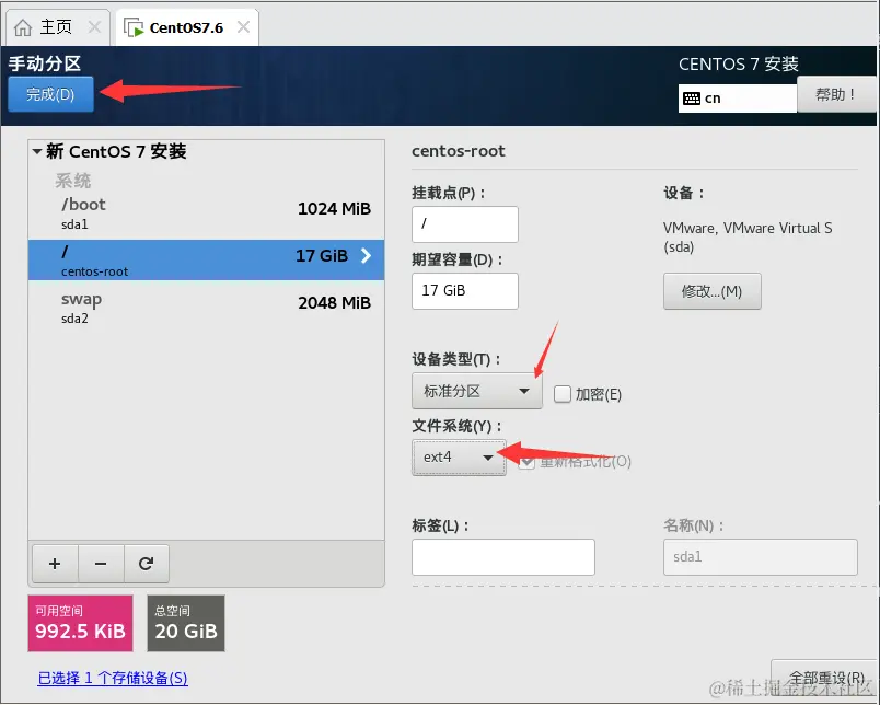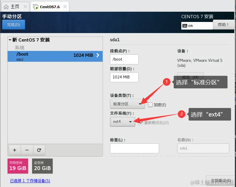 - 确定分区类型为“标准分区”,文件系统为“ext4”。
