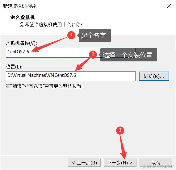 5、给虚拟机起个好听的名字,这个并不是主机名,只是在VMware中标识这个虚拟机的名字。并选择安装位置,建议安装在非系统盘。(家里有矿的随意……)