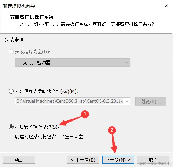 3、选择稍后安装操作系统。现在只是创建一个虚拟机空间。