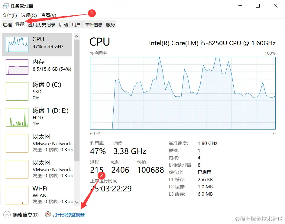 - 选择最下面的 “打开资源监视器”