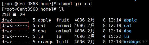 6、现在再次使用 cat 或root 用户,赋予 /home/cat 目录同组用户的 r 权限。