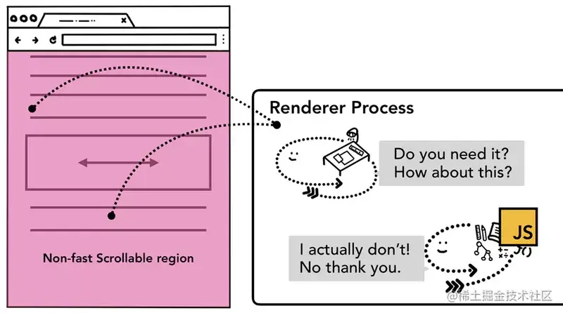 由于执行 JS 是主线程的工作,当页面合成时,合成器线程会标记页面中绑定有事件处理器的区域为非快速滚动区域(non-fast scrollable region),如果事件发生在这些存在标注的区域,合成器线程会把事件信息发送给主线程,等待主线程进行事件处理,如果事件不是发生在这些区域,合成器线程则会直接合成新的帧而不用等到主线程的响应。