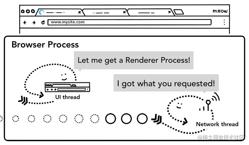 回车按下后,UI thread将关键词搜索对应的URL或输入的URL交给网络线程Network thread,此时UI线程使Tab前的图标展示为加载中状态,然后网络进程进行一系列诸如DNS寻址,建立TLS连接等操作进行资源请求,如果收到服务器的301重定向响应,它就会告知UI线程进行重定向然后它会再次发起一个新的网络请求。
