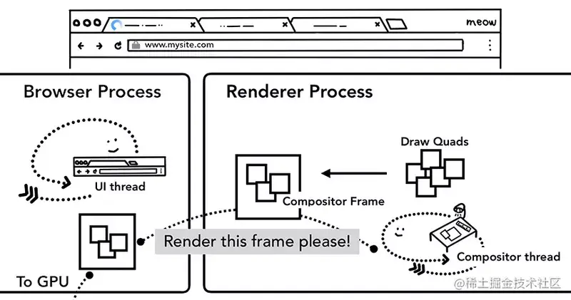 以上所有步骤完成后,合成线程就会通过IPC向浏览器进程(browser process)提交(commit)一个渲染帧。这个时候可能有另外一个合成帧被浏览器进程的UI线程(UI thread)提交以改变浏览器的UI。这些合成帧都会被发送给GPU从而展示在屏幕上。如果合成线程收到页面滚动的事件,合成线程会构建另外一个合成帧发送给GPU来更新页面。