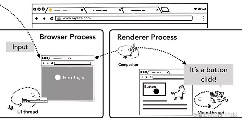 以点击事件(click event)为例,让鼠标点击页面时候,首先接受到事件信息的是Browser Process,但是Browser Process只知道事件发生的类型和发生的位置,具体怎么对这个点击事件进行处理,还是由Tab内的Renderer Process进行的。Browser Process接受到事件后,随后便把事件的信息传递给了渲染进程,渲染进程会找到根据事件发生的坐标,找到目标对象(target),并且运行这个目标对象的点击事件绑定的监听函数(listener)。