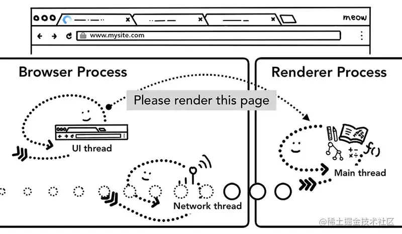 各种检查完毕以后,network thread 确信浏览器可以导航到请求网页,network thread 会通知 UI thread 数据已经准备好,UI thread 会查找到一个 renderer process 进行网页的渲染。