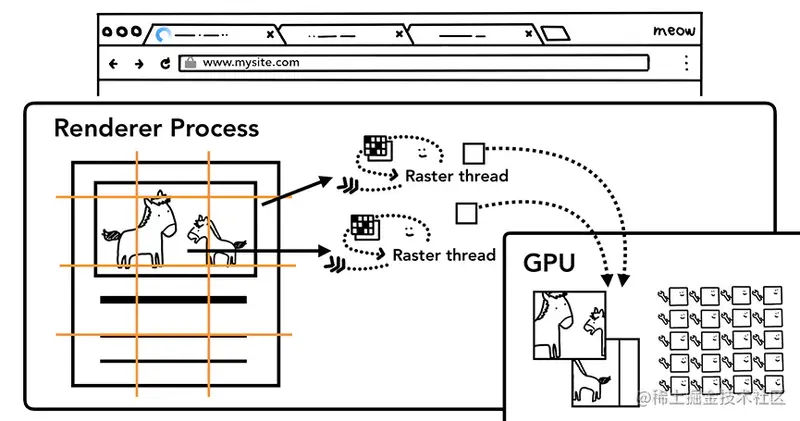 一旦Layer Tree被创建,渲染顺序被确定,主线程会把这些信息通知给合成器线程,合成器线程开始对层次数的每一层进行光栅化。有的层的可以达到整个页面的大小,所以合成线程需要将它们切分为一块又一块的小图块(tiles),之后将这些小图块分别进行发送给一系列光栅线程(raster threads)进行光栅化,结束后光栅线程会将每个图块的光栅结果存在GPU Process的内存中。