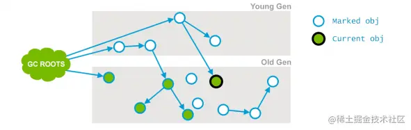 随后到了pre-cleaning(预清理阶段)阶段,该阶段的任务之一就是标记这些在并发标记阶段被修改了的对象,之后那些通过current obj变得可达的对象也被标记了,变成下面这样: