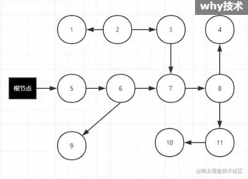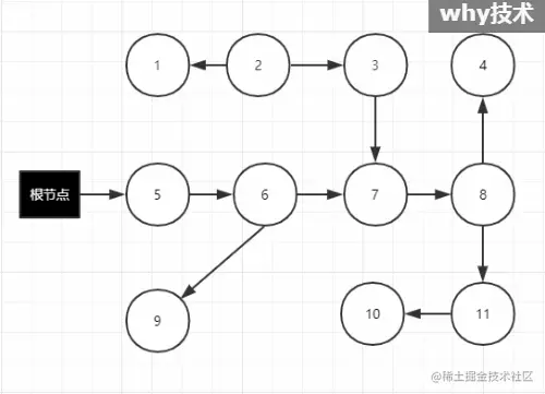 首先是初始状态,很简单,只有GC Roots是黑色的。同时需要注意下面的图片的箭头方向,代表的是有向的,比如其中的一条引用链是: 根节点->5->6->7->8->11->10