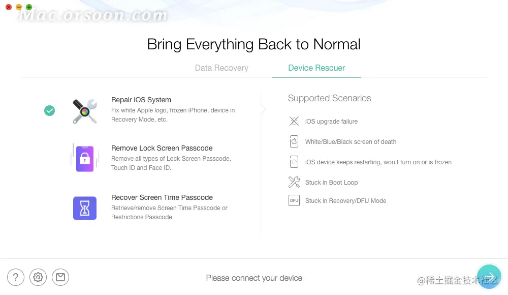 当您的设备(iPhone / iPad / iPod touch)陷入黑屏,白屏和Apple徽标甚至重启循环,强制开关机都没有任何办法时,PhoneRescue的iOS修复工具模式可轻松修复iOS设备。请参考详细指南以充分利用PhoneRescue。