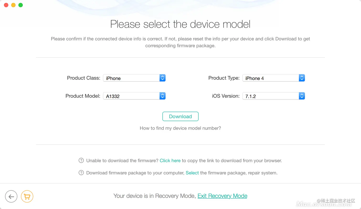 进入“恢复”模式后,请检查您的设备信息。要修复异常操作系统,请单击“下载”按钮以下载适用于您的iOS设备的固件。下载该程序包需要几分钟,因此请耐心等待。同时,请确保互联网连接稳定。