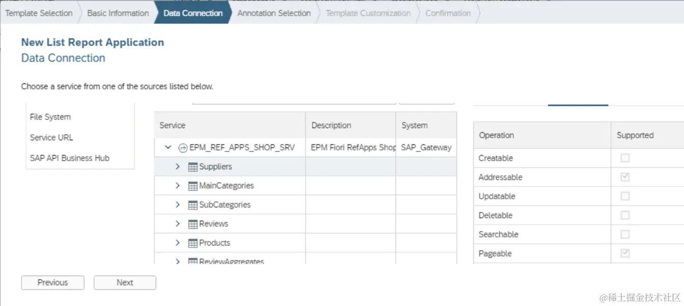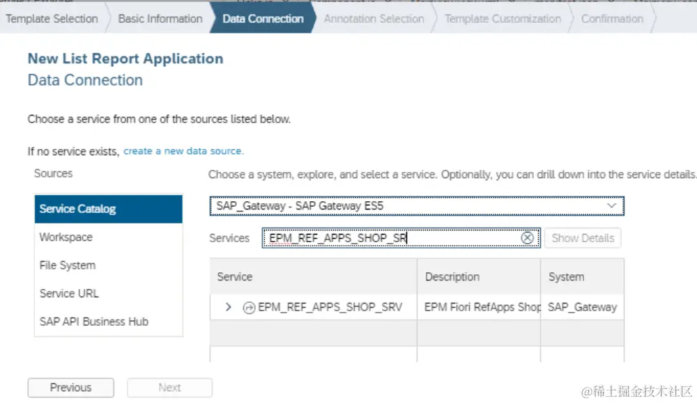 该List Report Application消费的OData服务,从Service Catalog的下拉菜单里选择指向ES5系统的Destination,从中选择EPM_REF_APPS_SHOP_SR这个服务: