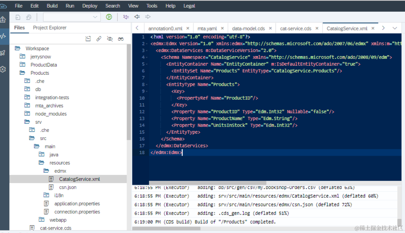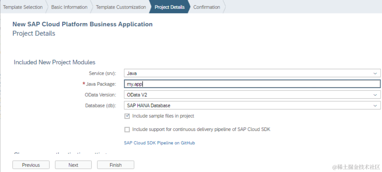 该srv实现类型选择为Java,package设置为my.app, 数据库技术选择SAP HANA database: