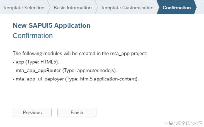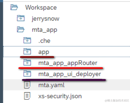 自动生成了一个MTA项目,包含一个html5 module,一个app router和一个UI deployer:
