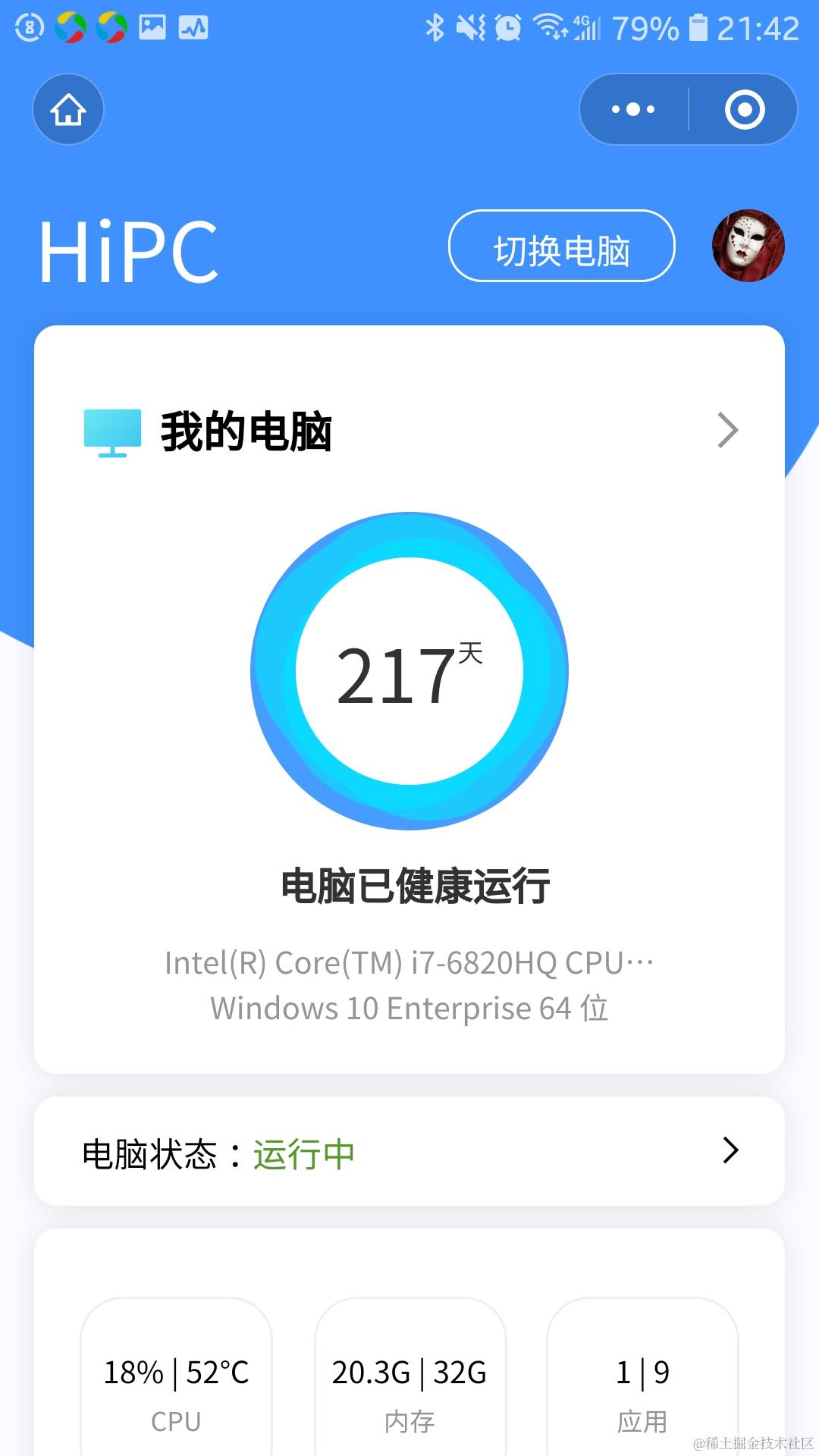 推荐一款可以监控电脑软硬件和操作电脑的微信小程序,名叫HiPC 已注销 2021-04-26 160 阅读1分钟 先得在电脑上安装客户端软件,可以从hipc.cn下载: 安装之后,在电脑上启动客户端,就可以用手机上的微信小程序监控电脑软硬件了。比如查看电脑上运行了哪些进程: 查看CPU的温度,和内存使用情况: 要获取更多Jerry的原创文章,请关注公众号"汪子熙":
