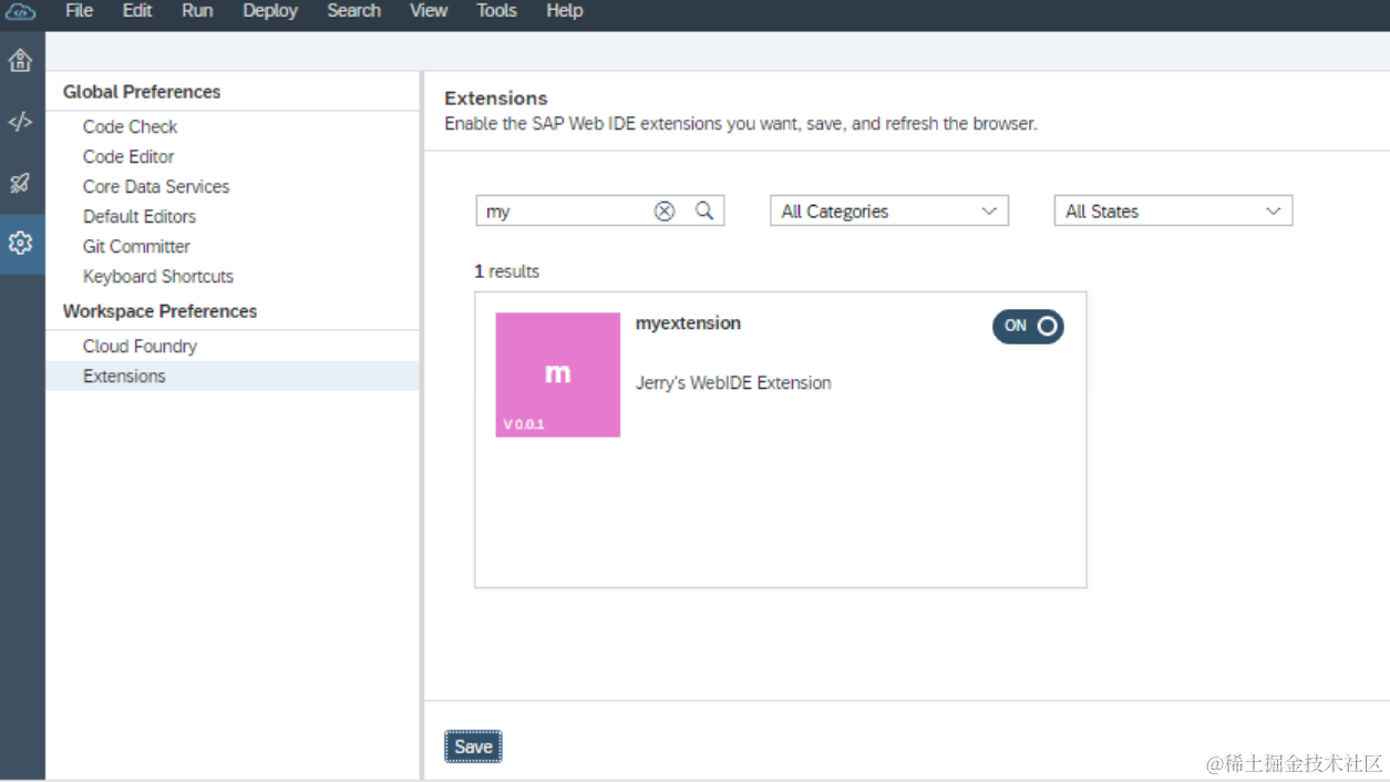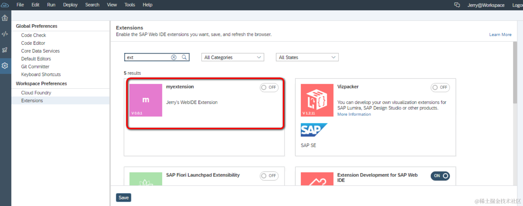 一切就绪后,在Workspace preference的Extensions菜单里,就能搜索出我们部署好的WebIDE extension,