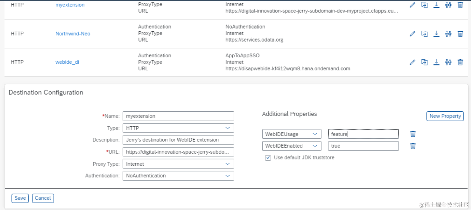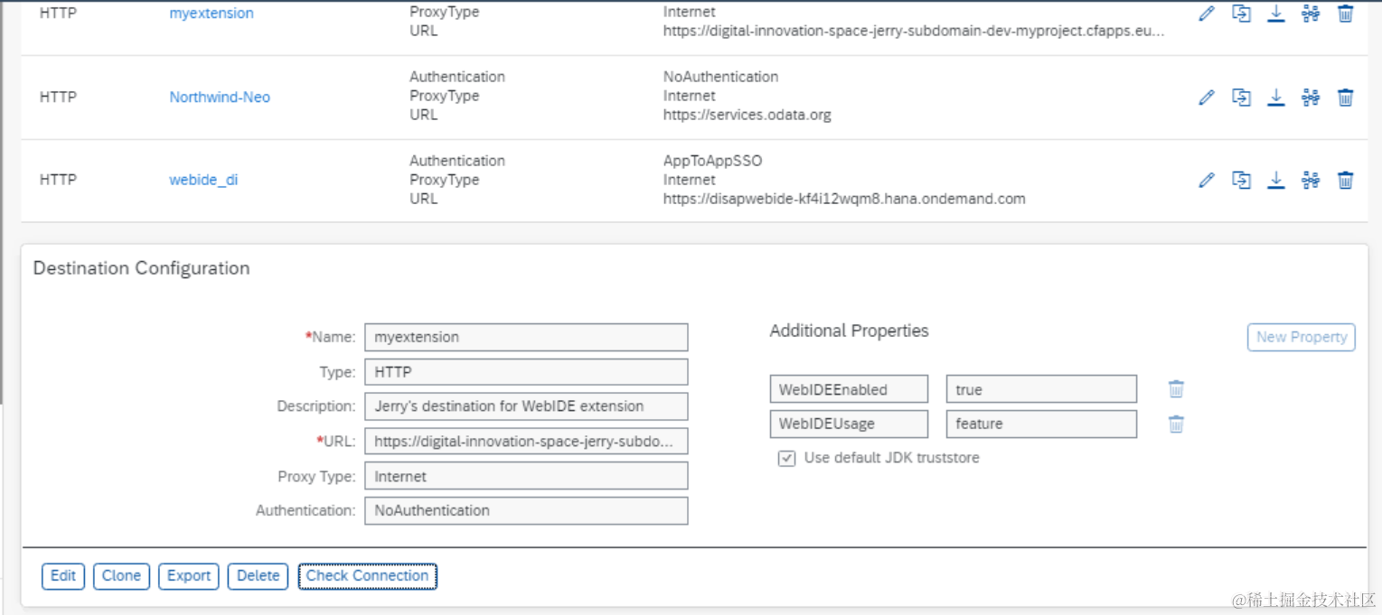 WebIDE只会解析Neo环境里创建的Destination,此处还要给Destination维护WebIDEEnabled和WebIDEUsage两个额外属性: