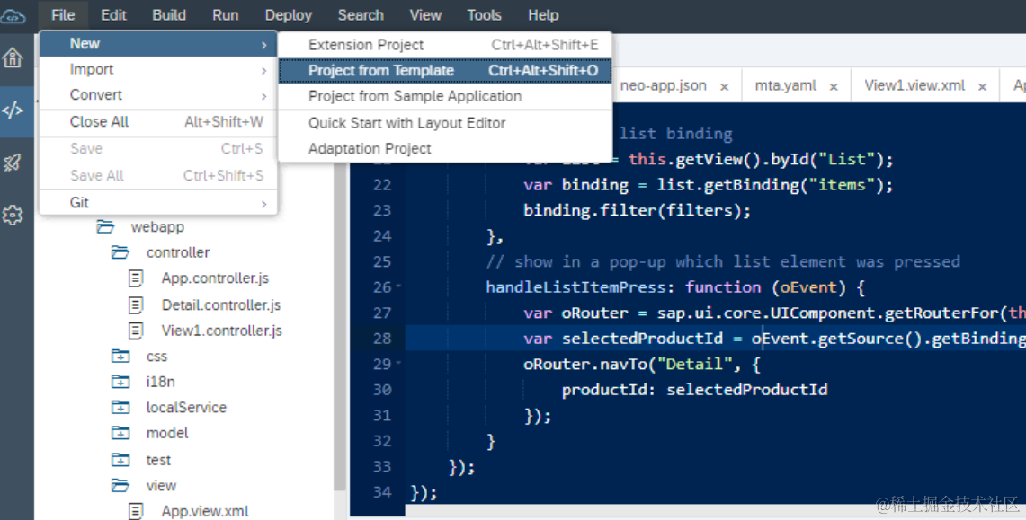 这个创建好的模板包含的功能很简单,在SAP WebIDE里新增一个菜单项,点击之后可以弹出Hello World,因此我们现在直接运行它。
