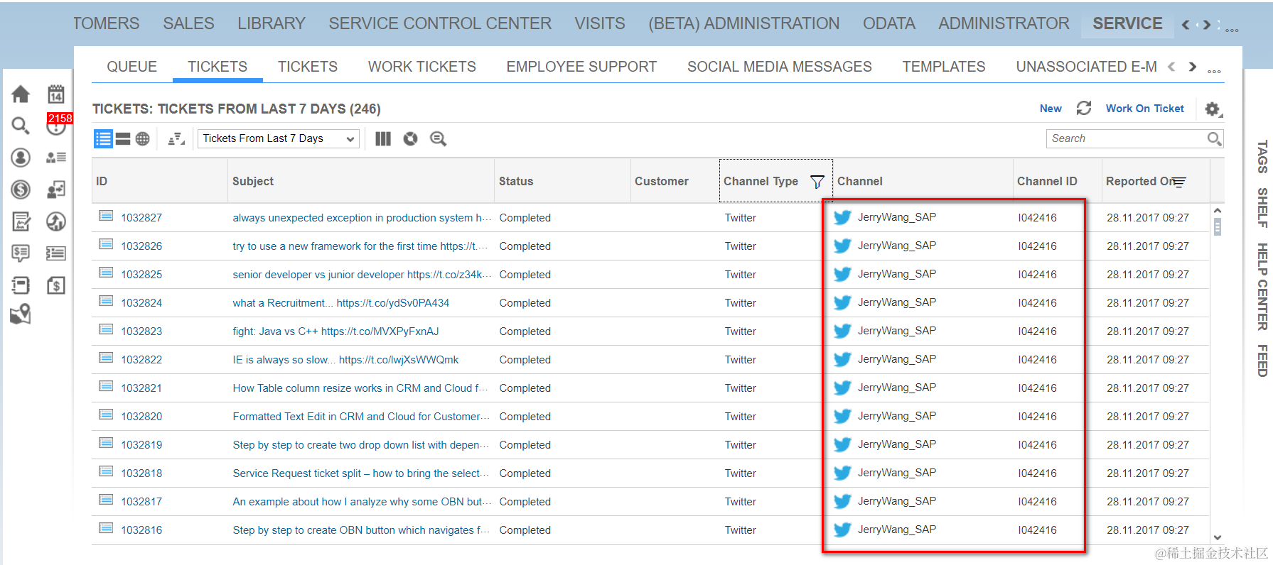 该job会将Twitter website里consumer key指向的twitter account发布的所有twitter抓到C4C来自动生成service request:
