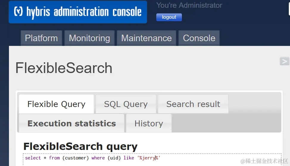 查看flexible query对应的SQL语句,发现select from里用到的{customer}被翻译成了真正的数据库表user. 大括号里定义的customer在hybris里称为code